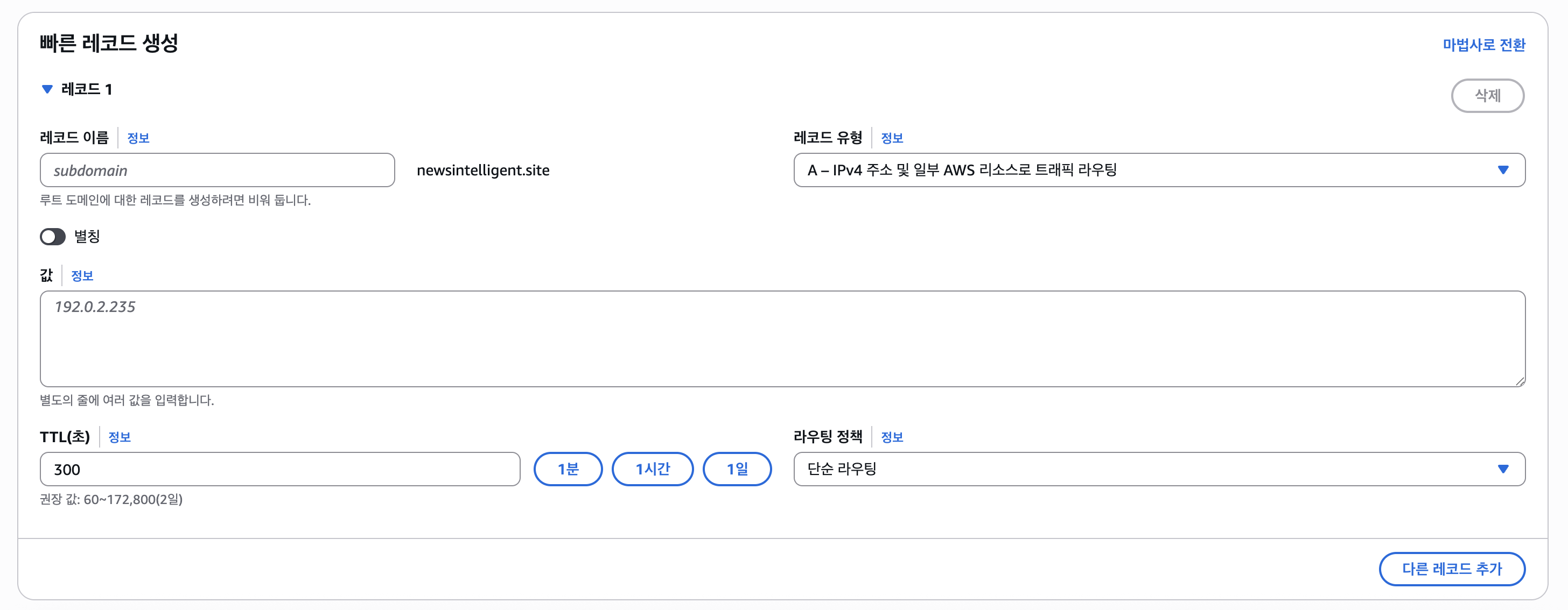 구매한 도메인을 EC2 public ip 주소로 매핑하는 역할 - 값 부분에 EC2 public ip 주소를 입력한다.