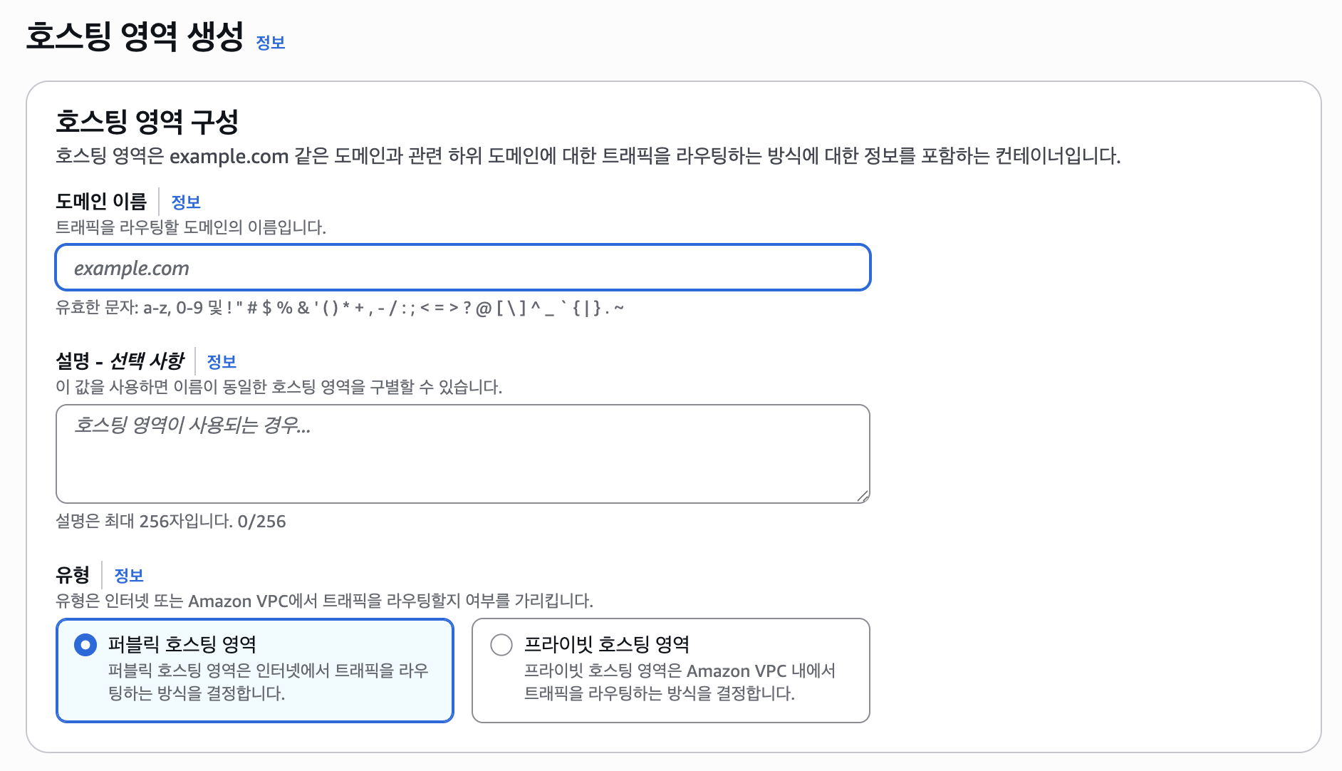 - 유형 : 퍼블릭 호스팅 영역으로 선택