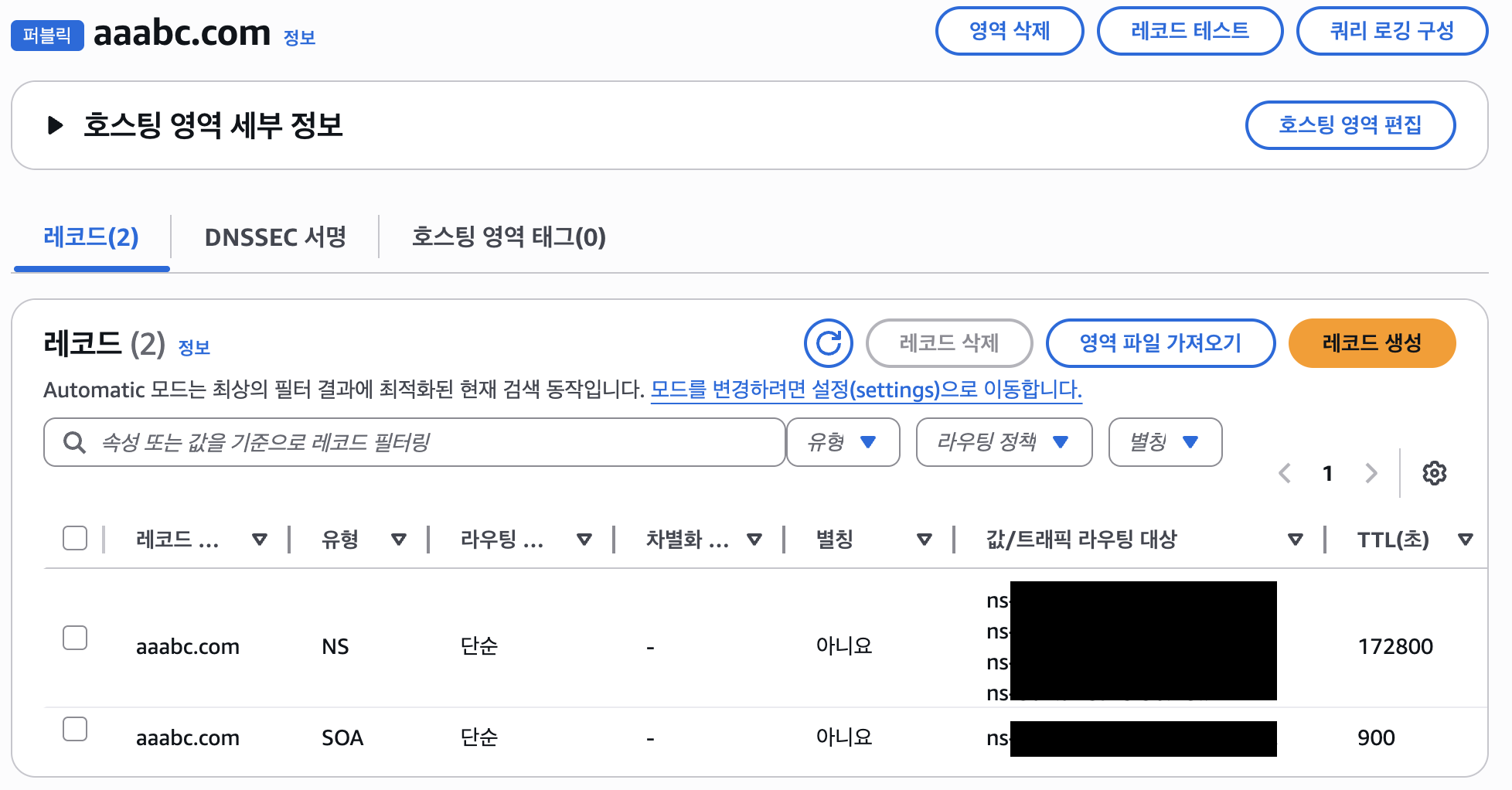 호스팅 영역으로 생성하면 다음과 같이 NS, SOA 레코드가 생성된다. (예시를 들기 위해 임의로 쓴 도메인이다.)
